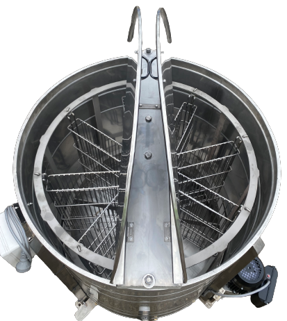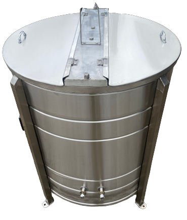 During the extraction process the honey is forced out of the uncapped wax cells by centrifugal force, runs down the walls and pools at the bottom of the S/S extractor. A tap or honey pump allows for the removal of honey from the extractor.