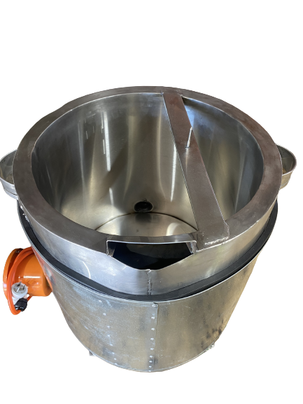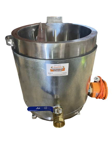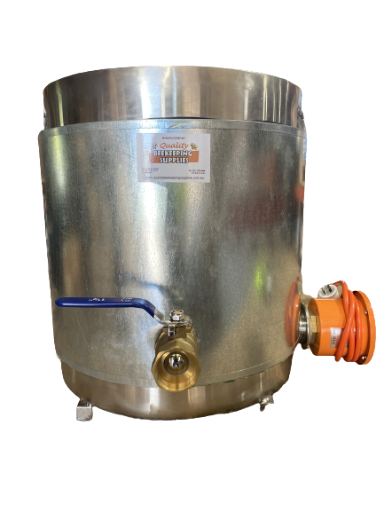 This is the perfect solution to uncapping, for those with 20-100 hives. The cappings (with honey) are melted, and flow into a bucket. Next day a solid block of wax floats on top of the honey. Open the gate - the honey flows out. Lift the block of wax off the top.