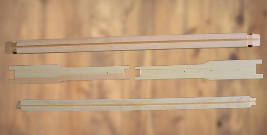 A wood frame with a grooved bottom bar to hold the the plastic foundation. Size is: Height 232 mm Top to Bottom.