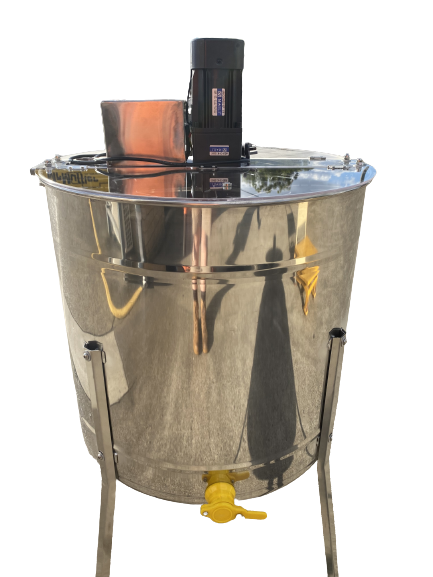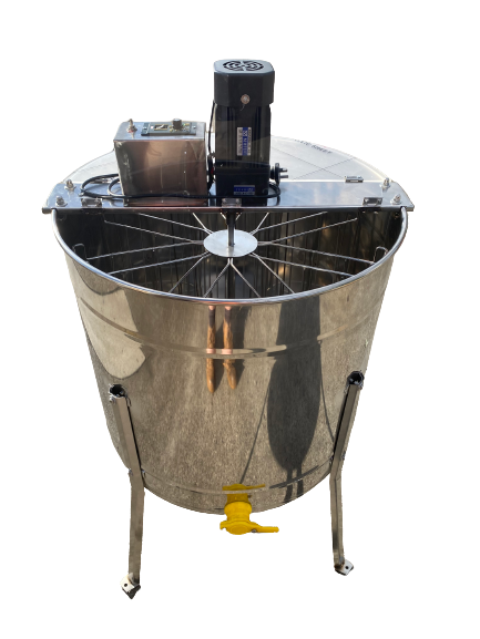 This 8 frame stainless steel motorized variable speed Radial extractor saves your arms. It is on legs high enough to place a 10 Ltr / 15 Kg bucket under the outlet.