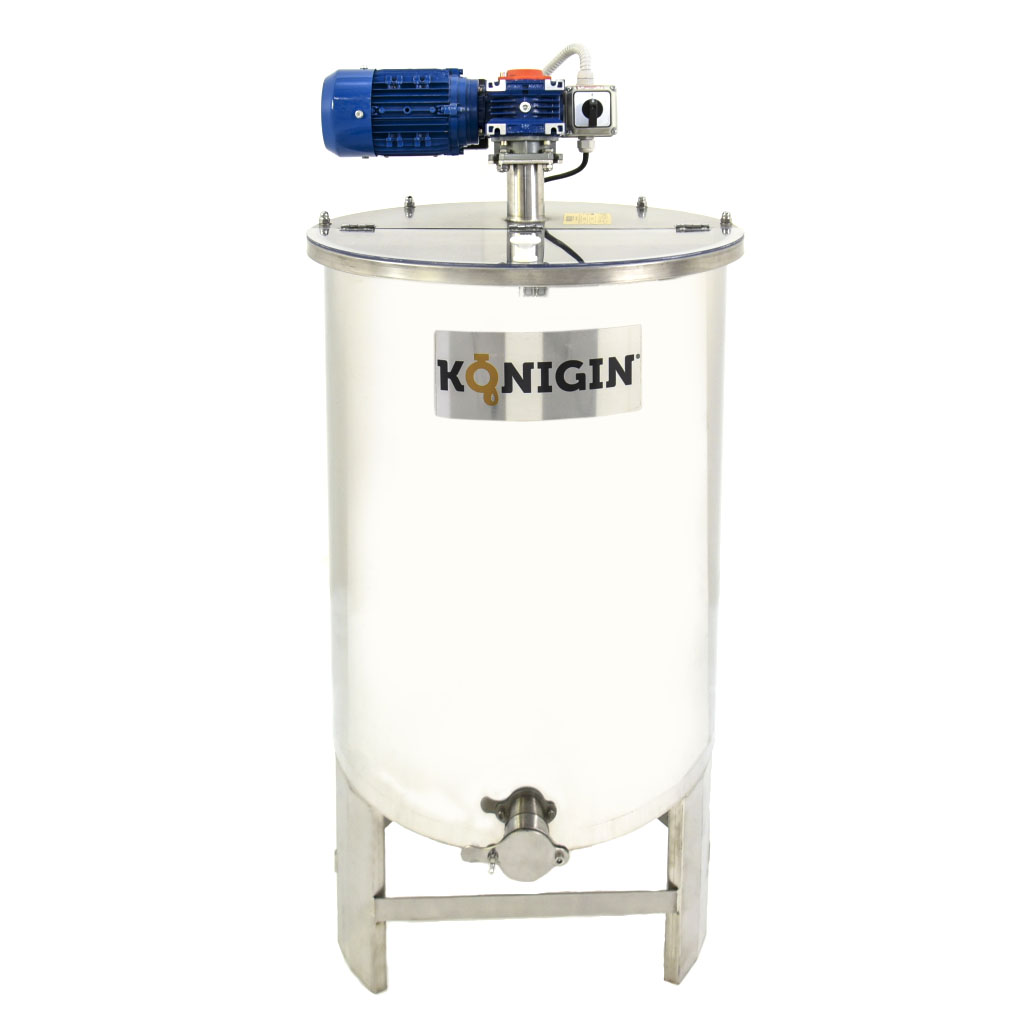 The TT-K-100 is a robust 100 L honey container equipped with a manual mixer, designed for efficient mixing and storage of honey. It features legs for stability and comes with either a tap or screw tube for controlled dispensing. Constructed from 1.4301 stainless steel, it ensures long-lasting durability and hygienic handling.