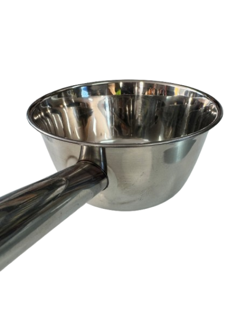 A strong, food-grade stainless steel scoop designed for handling honey, sugar, wax, and other beekeeping materials.